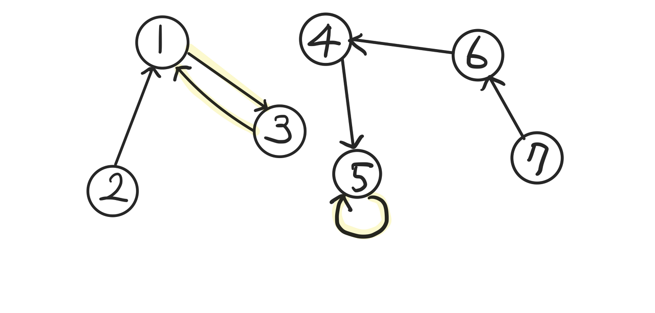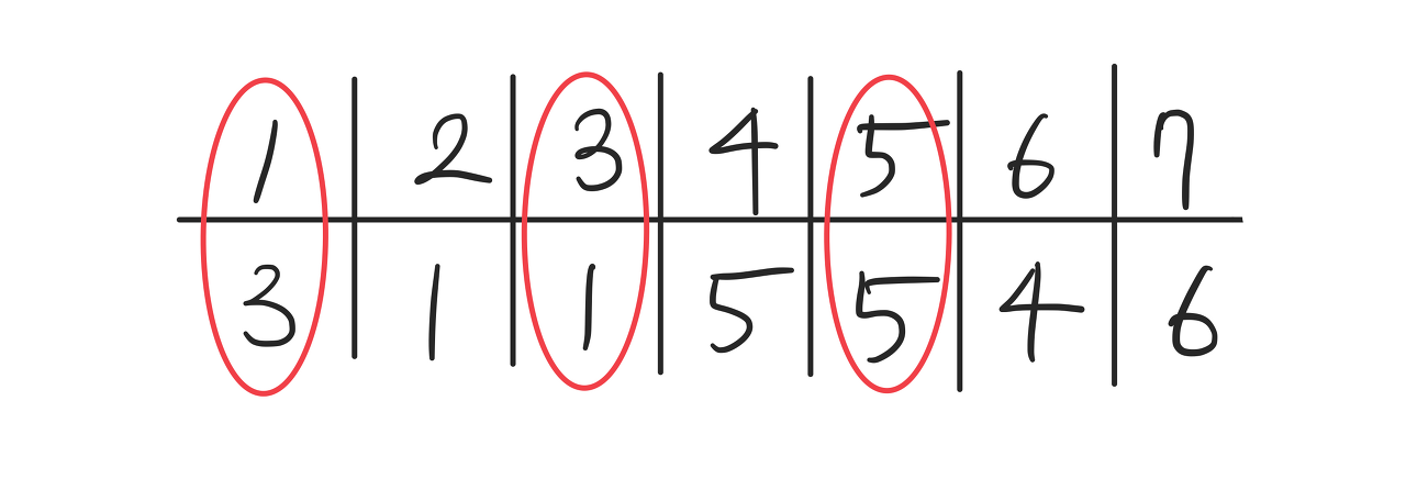 세로 두 줄, 가로로 N개의 칸으로 이루어진 표가 있다. 첫째 줄의 각 칸에는 정수 1, 2, …, N이 차례대로 들어 있고 둘째 줄의 각 칸에는 1이상 N이하인 정수가 들어 있다. 첫째 줄에서 숫자를 적절히 뽑으면, 그 뽑힌 정수들이 이루는 집합과, 뽑힌 정수들의 바로 밑의 둘째 줄에 들어있는 정수들이 이루는 집합이 일치한다. 이러한 조건을 만족시키도록 정수들을 뽑되, 최대로 많이 뽑는 방법을 찾는 프로그램을 작성하시오. 예를 들어, N=7인 경우 아래와 같이 표가 주어졌다고 하자.